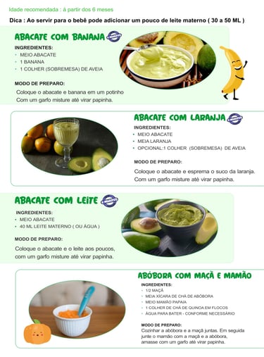 ✅ Variedade nutritiva: combinações pensadas para textura, sabor e nutrientes em cada fase do bebê.