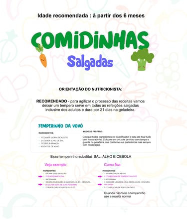 Receitas práticas, formuladas por profissionais de nutrição. Tudo simples com ingredientes do dia-dia, preparo super rápido, tudo isso organizado e separado para cada idade de 6 meses até +2 anos.